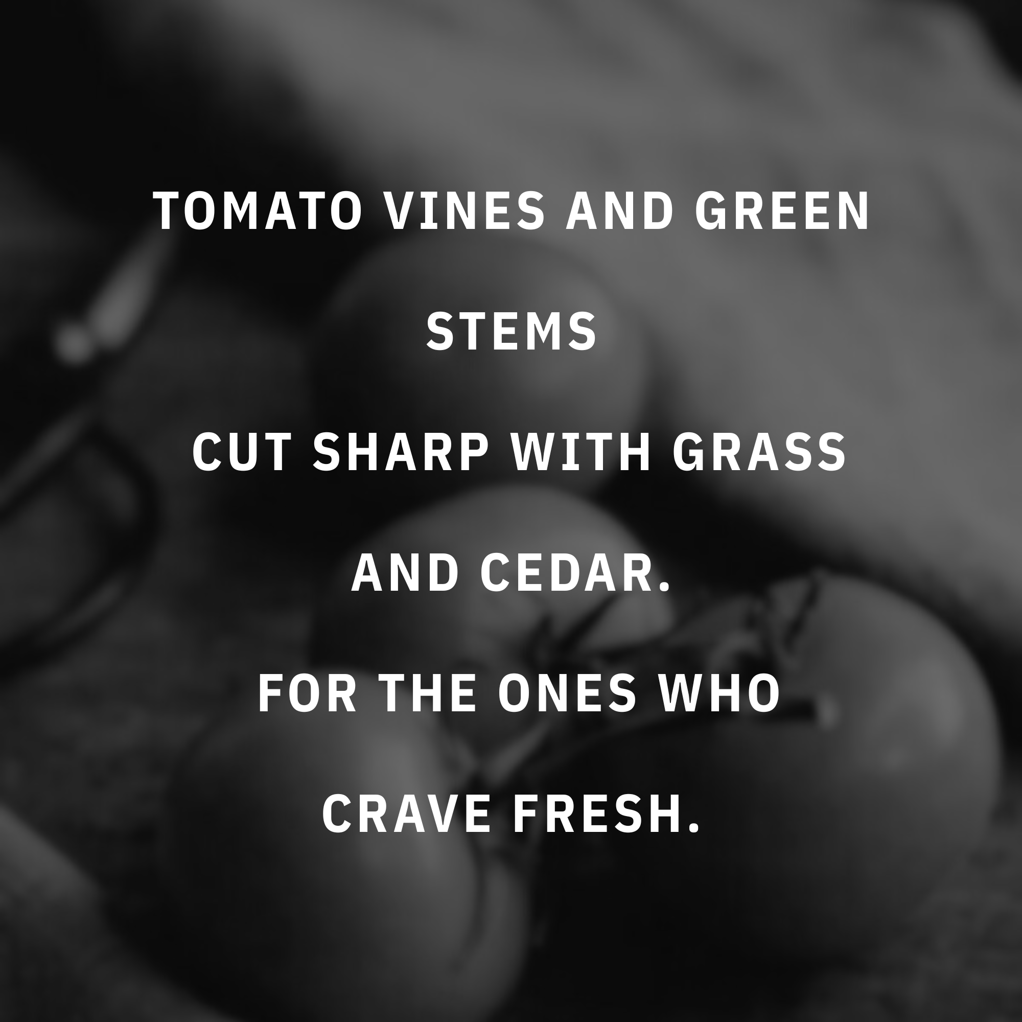Heirloom opens with crisp grass and lavender — sharp, clean, unmistakable. At the heart: ripe tomato vines. Raw, sun-warmed, alive. Grounded by cedarwood and wild fruits.